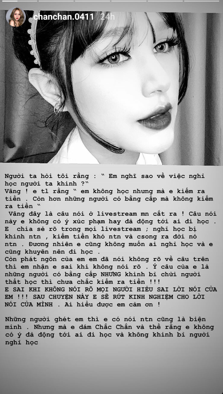 Còn phát ngôn của em, em đã nói không rõ về câu trên thì em xin nhận sai khi không nói rõ. Ý câu của em là những người những người có bằng cấp nhưng khinh bỉ chửi người thất học thì chưa chắc kiếm ra tiền! Em sai khi không nói rõ, mọi người hiểu sai ý của em! Sau chuyện này, em sẽ rút kinh nghiệm cho lời nói của mình. Ai hiểu được em cảm ơn! Những người ghét em thì em có nói như thế nào cũng là biện minh. Nhưng mà em chắc chắn và thề rằng em không có ý đả động tới ai đi học và không khinh bỉ người nghỉ học”.