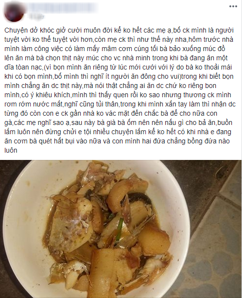 Các mẹ nghĩ sao ạ? Sau này bà già bà ốm nên nên nấu gì cho bả ăn? Buồn lắm luôn nên đừng chửi em tội. Nhiều chuyện lắm kể không hết! Có khi nhà em đang ăn cơm bà quét hất bụi vào nữa và con mình hai đứa chẳng bồng đứa nào luôn”.
