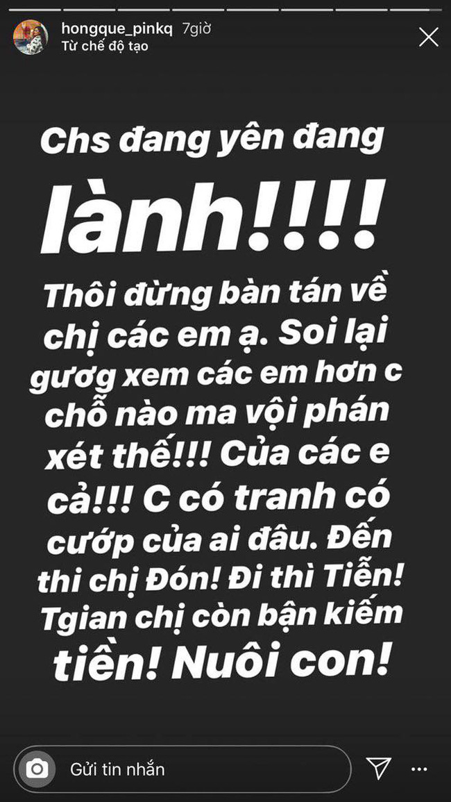 Mới đây, Hồng Quế cũng đã đăng dòng trạng thái phủ nhận mối quan hệ thân mật với Huỳnh Anh lên Instagram với thái độ vô cùng bức xúc: “Chả hiểu sao tự dưng đang yên đang lành. Thôi đừng bàn tán về chị các em ạ. Soi gương xem các em hơn chị chỗ nào mà vội phán xét thế. Của các em cả! Chị có tranh có cướp của ai đâu! Đến thì chị đón, đi thì tiễn! Thời gian chị còn bận kiếm tiền, nuôi con!”