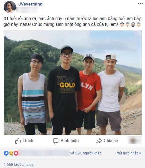 JV viết: “31 tuổi rồi anh ơi, bức ảnh này 5 năm trước là lúc anh bằng tuổi em bây giờ này. Chúc mừng sinh nhật ông anh cả của tụi em”.