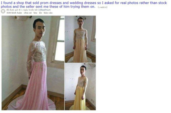 Đây là lời kể của vị khách nữ kia trên trang mạng xã hội Reddit: “Tôi thấy một shop bán đầm dạ hội và váy cưới nên tôi đã yêu cầu được xem ảnh thật chứ không phải là ảnh mẫu. Vậy là chủ shop đã gửi cho tôi một bức hình chụp chính anh ta mặc váy đó luôn”.