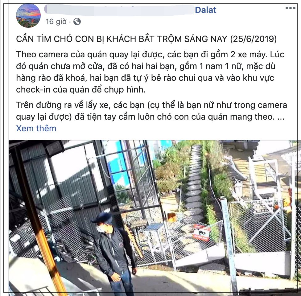 Cụ thể, quán cafe nơi có chú chó bị bắt trộm tên là S.F, ở Đà Lạt. Fanpage của quán cafe này đã đăng tải bài viết kêu gọi Tìm chó con bị khách bắt trộm vào sáng ngày 25/6 vừa qua.