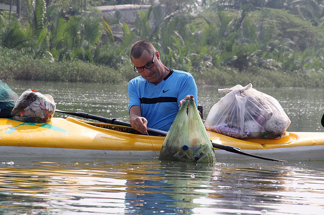 Ông Paul Lasenby (44 tuổi, quốc tịch Anh) tỏ ra thích thú với tour vớt rác trên sông Hoài.