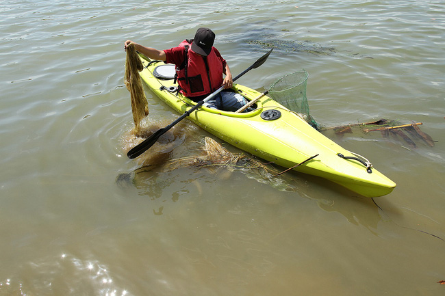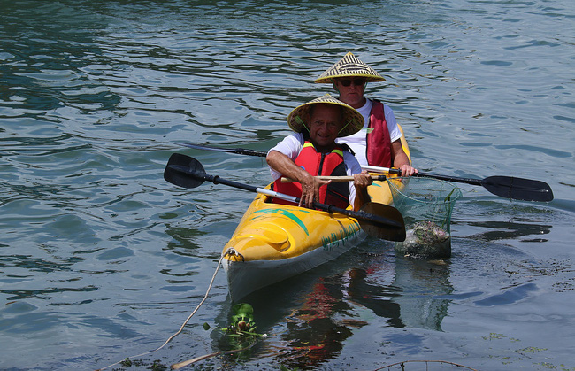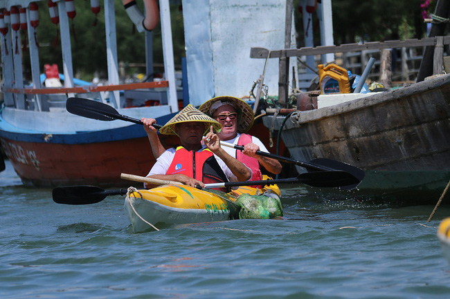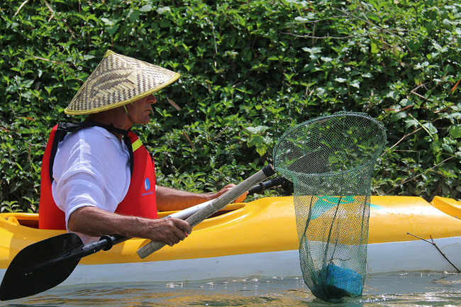 Suốt hành trình sẽ có 2 nhân viên điều khiển thuyền máy tập kết rác từ các thuyền kayak của khách vớt được để chở đi tiêu hủy.