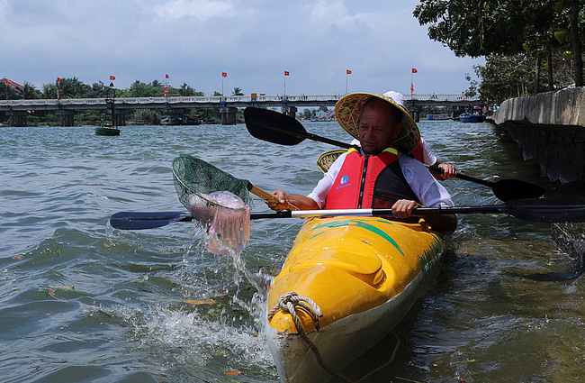 Theo đó, khách du lịch tham gia sẽ tự chèo thuyền kayak và dùng vợt để vớt rác trên đoạn đường dài khoảng 8km dọc khu vực sông Hoài từ xã Cẩm Thanh vào phố cổ Hội An.