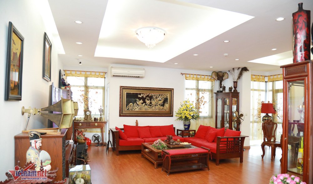 Ngoài những đồ vật giả cổ, phòng khách nhà Hà My còn bày nhiều bức tranh sơn mài với gam màu mạnh.