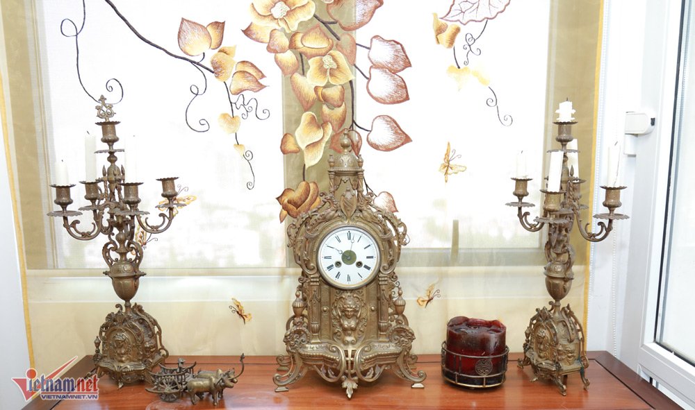 Đồng hồ, kệ nến được làm giả cổ bên cạnh chiếc rèm cửa được thêu hình hoa mai.
