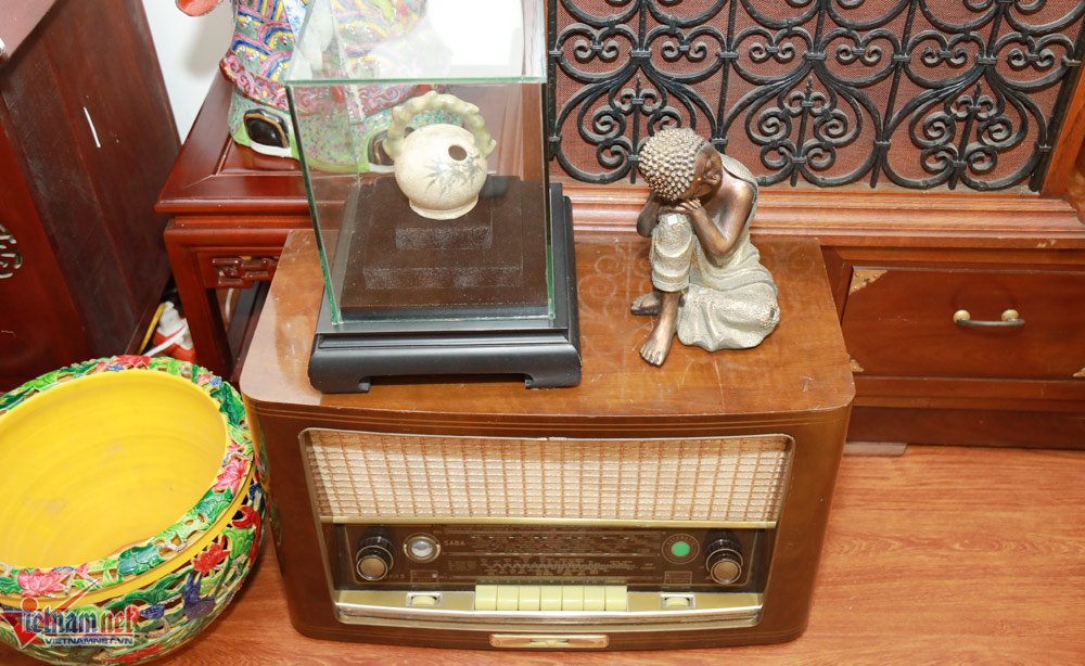 Chiếc đài FM cổ và bình vôi cổ được mẹ Hà My sưu tầm.