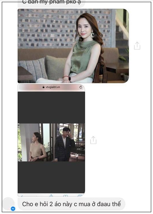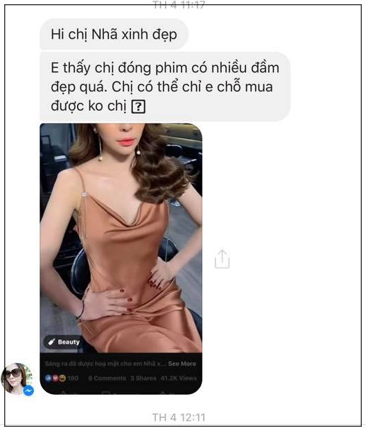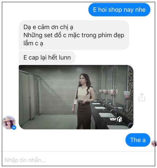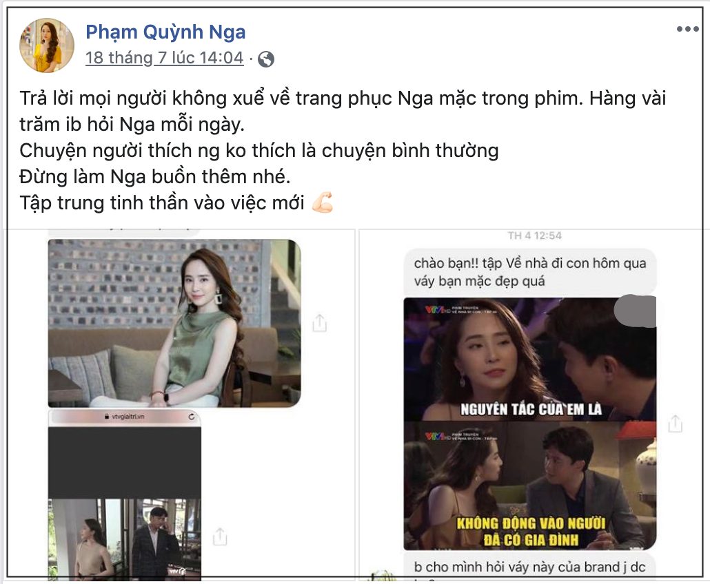 Inbox hỏi mua váy nhiều đến mức mới đây, Quỳnh Nga đã phải đăng status cho biết cô không thể trả lời hết tất cả các inbox hỏi về trang phục mà cô mặc trong phim. Nhưng cô vẫn cố gắng trả lời các fans nếu có thời gian.