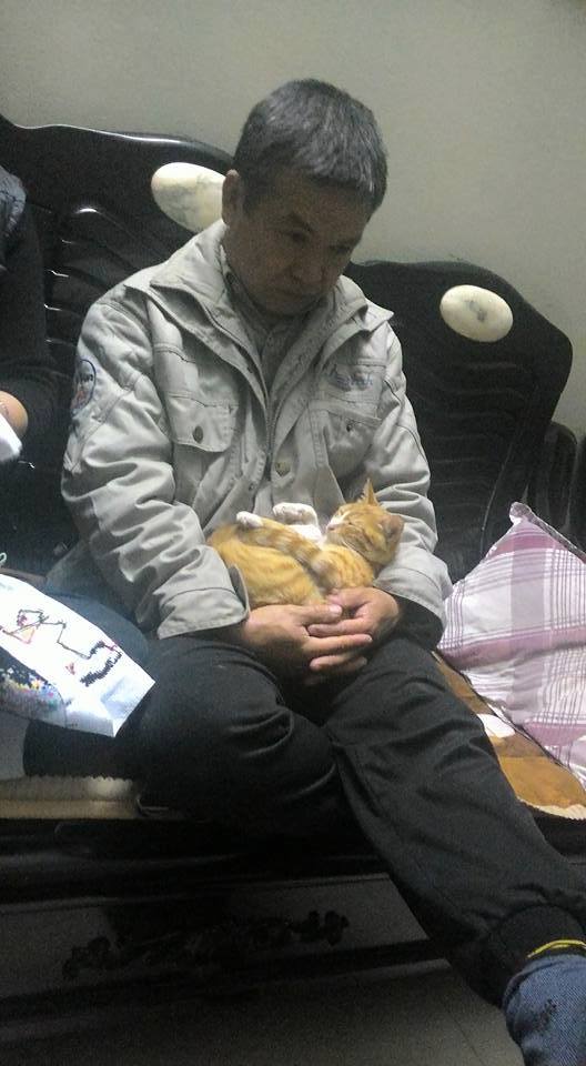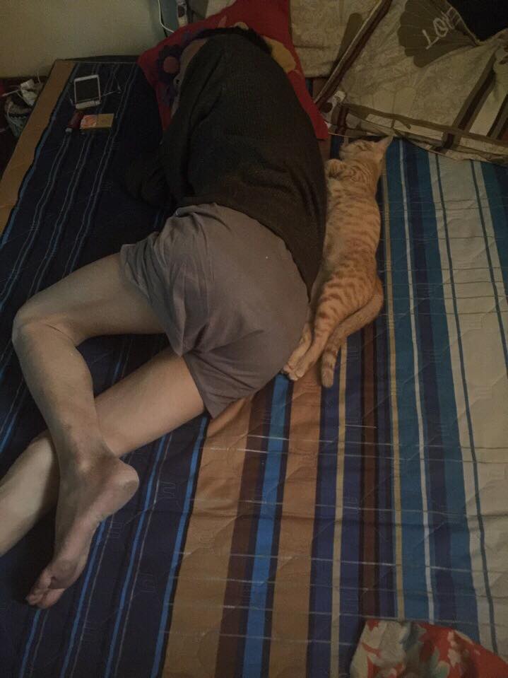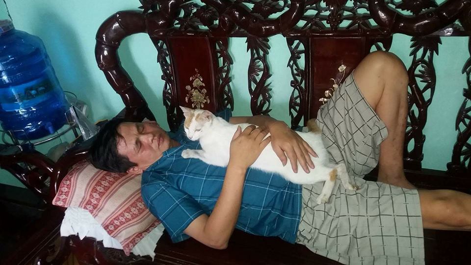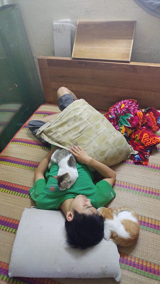”Tao vừa chụp cách đây 10 phút. Hồi trước tao nhặt nó về, bố tao còn bảo ”Thôi mày vứt đi đâu thì vứt, đừng có tha lôi về nhà”. Được vài ngày thì ra thế này. Mà cái con tiểu nhãi (tên con mèo) này nó cũng khôn lắm cơ. Ngủ thì phải có người nằm cạnh, ăn cơm thì nó cứ leo lên người bố tao ngồi, bám bố như đỉa nên giờ bố tao cũng chẳng nỡ bảo vứt nó đi nữa” (Vũ Hoàng Long).