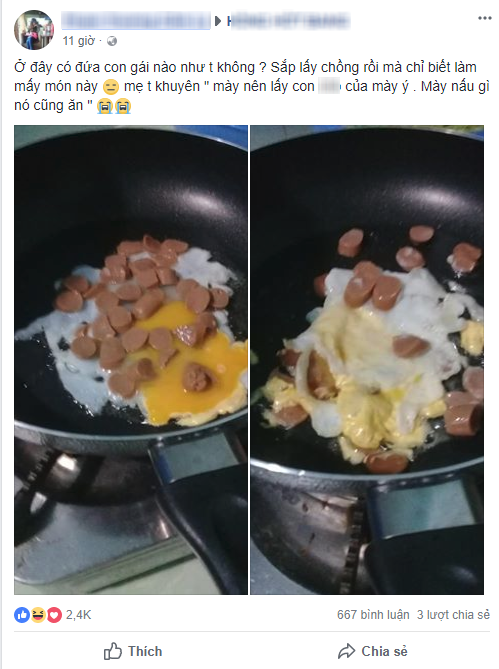 Có nhiều người lên tiếng đồng cảnh ngộ với chủ nhân của bài viết trên vì tính vụng về. FB Dy Dạo chia sẻ “Tớ tưởng tao tệ, ai ngờ bạn còn tệ hơn cả tao. Nhưng nói thật, tớ cũng chiên trứng giống cậu đấy”.