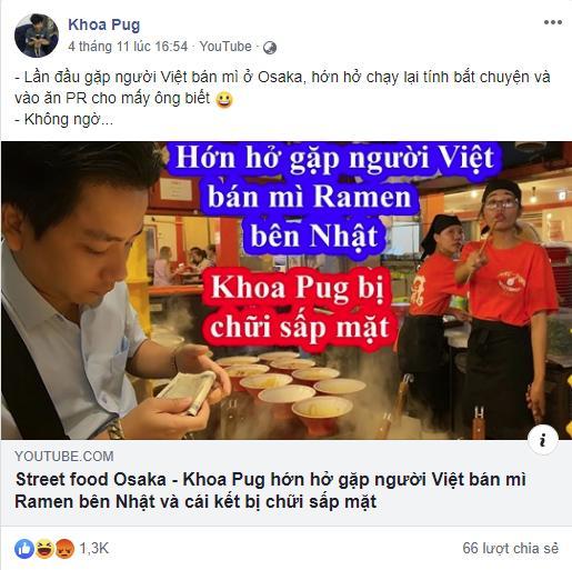 Cách đây vài ngày, sau khi đăng tải đoạn video clip review du lịch Nhật Bản trên trang cá nhân, Khoa Pug đã gây xôn xao dư luận và tạo ra nhiều làn sóng chỉ trích. Cụ thể trong video, Khoa Pug cho rằng người phục vụ Nhật Bản đã “quỳ khóc xin” anh ta cho người quay phim được ăn cùng. Tuy vậy, những người biết và thành thạo tiếng Nhật liền chỉ ra nội dung Khoa Pug ghi hoàn toàn không đúng sự thật. Thay vào đó, nội dung thực tế lại là việc nữ nhân viên không muốn Khoa Pug ghi hình và đã từ chối phục vụ.