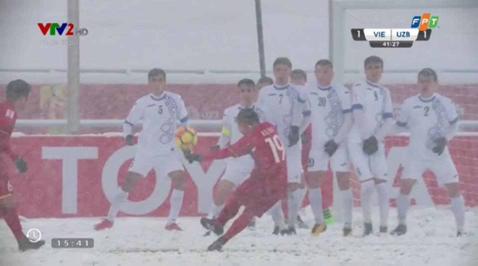 Đó là khi Quang Hải chuẩn bị đá phạt, Tiến Dũng đã bỏ cả khung thành, chạy lên phía khung thành của đội bạn để…. xem Quang Hải đá phạt. Điều này đã khiến cư dân mạng thốt lên: ”Ơ kìa, phải chăng Tiến Dũng biết chắc Quang Hải sẽ ghi bàn nên mới can đảm bỏ cả lưới nhà như vậy?”