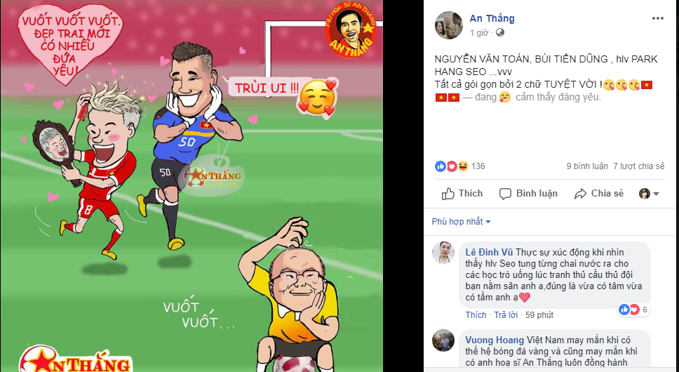 Trên mạng xã hội, khoảnh khắc Văn Toàn ghi bàn ở phút 108 vẫn đang được đông đảo người hâm mộ chia sẻ. Cùng với đó là vô vàn những khoảnh khắc xúc động khác, trong đó có cảnh Quang Hải bị chảy máu nằm trên sân và HLV Park Hang-seo tranh thủ tung chai nước cho học trò.