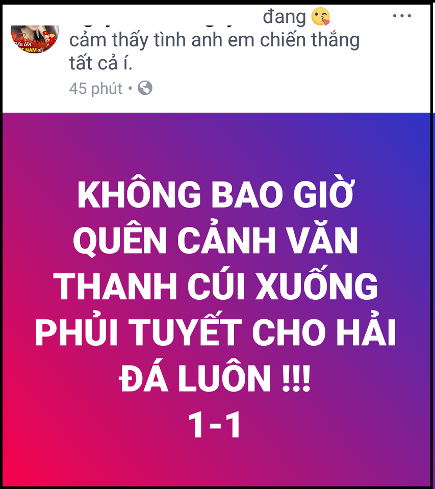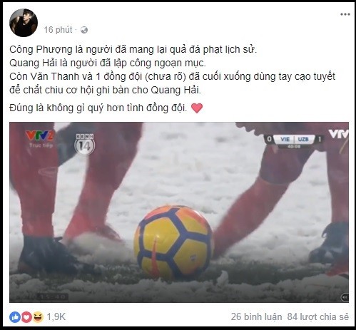 ”Nhìn các cầu thủ chạy ra cào tuyết để đồng đội có thể đá phạt dễ dàng hơn, thấy sao xúc động quá. Bất kể thắng hay thua, thì các bạn đã là người hùng trong lòng mình rồi” - Facebooker Châm Nguyễn.