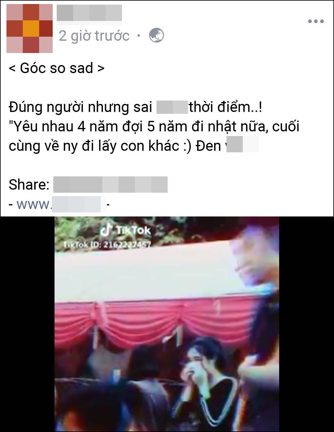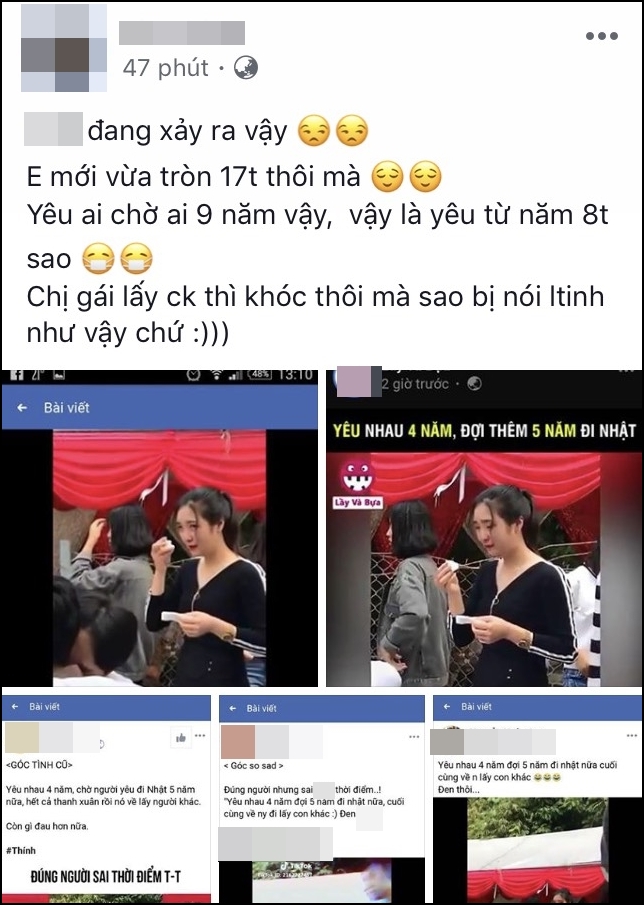 Mới đây, cư dân mạng đang truyền tay nhau chia sẻ một đoạn clip ngắn về một cô gái đang khóc nức nở trong đám cưới. Cô nàng liên tục vừa rơi nước mắt vừa hướng về phía cô dâu chú rể trong rạp cưới. Điều đặc biệt, hình ảnh được ghi kèm caption là: “Yêu nhau 4 năm đợi 5 năm đi Nhật nữa, cuối cùng về người yêu đi lấy con khác. Đen thật”.