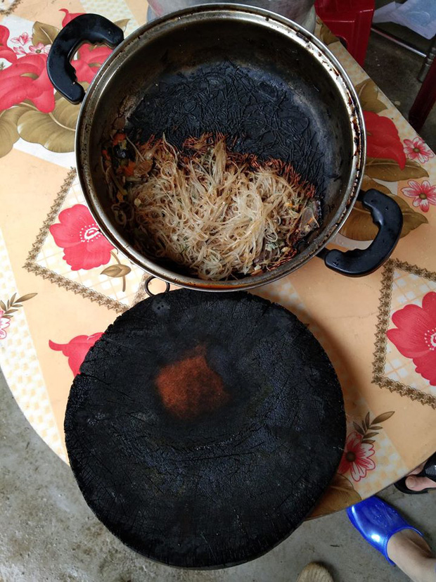 Cô bạn tự đăng bài chia sẻ lên trang cá nhân của mình và viết: “Đây là thành quả mẹ bảo mình trông nồi miến để đãi khách. Mùng 1 Tết, toang thật rồi! Chúng mày thắc mắc vì sao cái thớt nó lại cháy ư? Vì mẹ bảo hơ nó lên bếp gas cho nó khô để chặt gà và nó thành ra như vậy”, kèm với đó là những bức ảnh chụp cận cảnh những “tác phẩm” của cô.