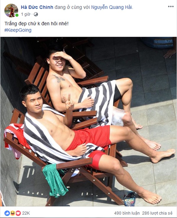 Mới đây nhất, “thánh lầy' Đức Chinh lại khiến cộng đồng mạng thích thú với bức ảnh anh đang tắm nắng cùng với tiền đạo Quang Hải. Đáng chú ý, lần này, Chinh “đen” đã mạnh dạn khẳng định mình “trắng đẹp chứ không đen hôi” khiến các fans không khỏi bật cười.