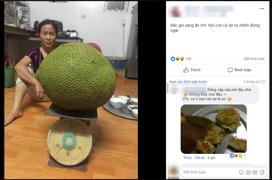 “Mùa hè ăn mít mụn chi chít nhưng vẫn thích. Lần đầu thấy quả mít khủng mà chủ thớt lại giấu kè kè múi nó to hay nhỏ, “thả thính không thơm” chút nào”, tài khoản V.P bực tức.