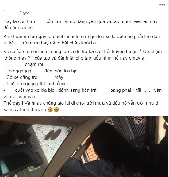 Chia sẻ của cô gái khiến dân mạng hốt hoảng.Việc của nó mỗi lần đi cùng mình là để trả lời câu hỏi huyền thoại: “Có chạm không mày?” của tao và đánh lái cho mình kiểu như thế này các bạn ạ: