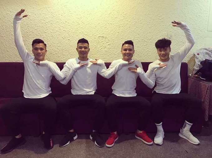 4 chàng cầu thủ U23 Việt Nam vui vẻ tạo dáng chụp hình.