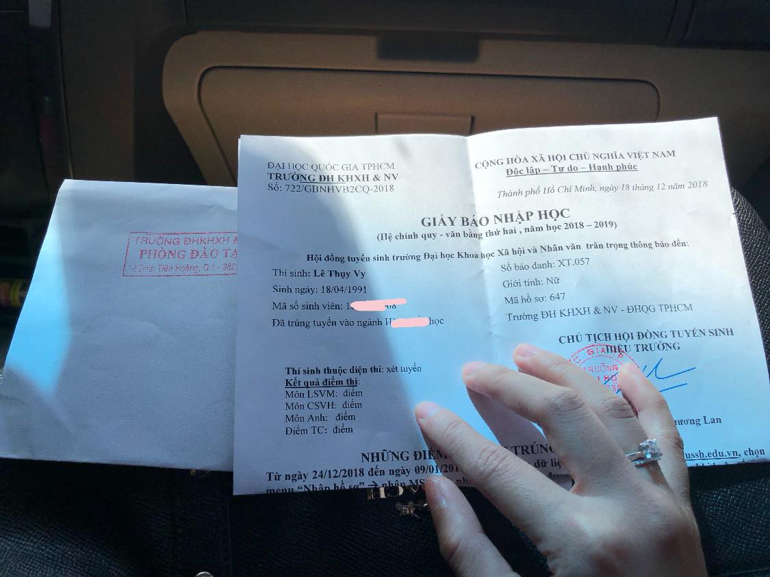 Mới đây, trên Facebook cá nhân của Thụy Vy vừa đăng tải hình ảnh giấy báo nhập học văn bằng 2 tại Đại học Khoa học Xã hội và Nhân văn. Tuy nhiên, điều gây chú ý chính là chiếc nhẫn kim cương trên ngón tay áp út của cô khiến nhiều người đinh ninh rằng cô gái này là bà xã tương lai của Tiến Đạt.