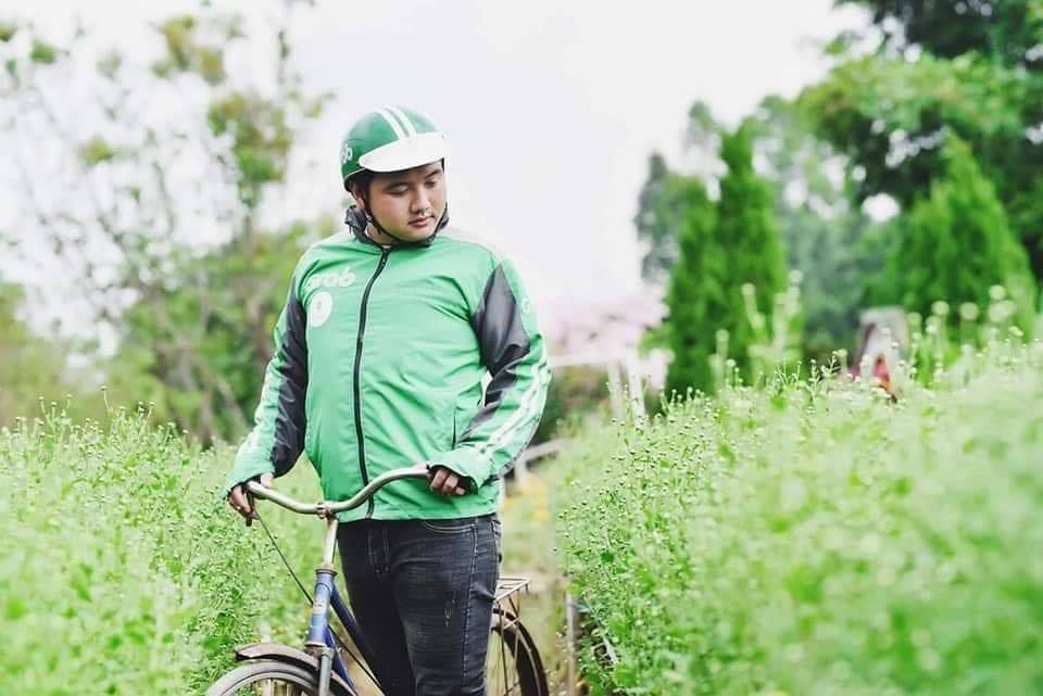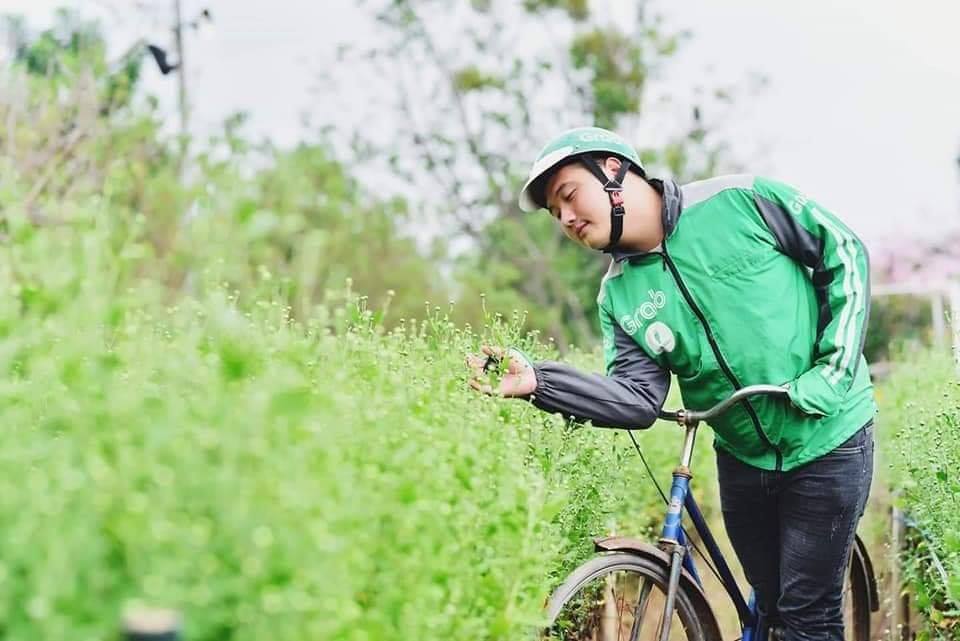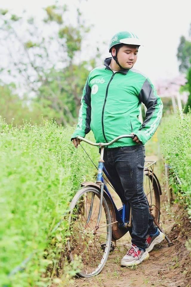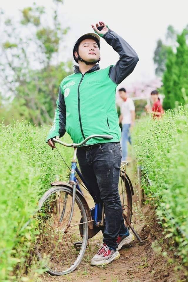 Chàng trai trẻ có thân hình hơi mũm mĩm chọn đồng phục của Grab, nón bảo hiểm Grab và lựa chọn bối cảnh là vườn hoa cúc họa mi. Tuy nhiên, điều khiến cộng đồng mạng thích thú chính là “thần thái” và cách tạo dáng “bá đạo” của chàng trai này.
