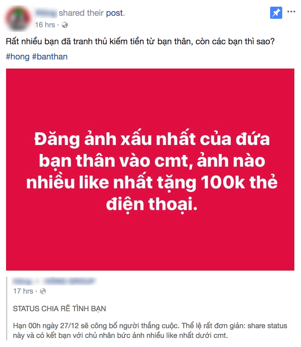 Mới đây, cộng đồng mạng lại “dậy sóng” bởi 1 cuộc thi gây chia rẽ tình cảm khi đặt ra thể lệ: đăng ảnh xấu nhất của bạn thân, ai được nhiều like nhất sẽ nhận được thẻ điện thoại 100k. Cứ tưởng tình bạn thắm thiết sẽ không bị ảnh hưởng bởi “vật chất”, nhưng nào ngờ, rất nhiều người đã đem bạn mình ra “bán rẻ” chỉ vì 100k như thế này đây.