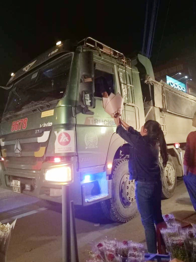 Đi kèm với bức ảnh, một fanpage có đông người theo dõi còn chia sẻ dòng caption khá mùi mẫn: “Câu chuyện người lái xe đêm 19/10. Ngày thường anh lái chiếc xe cả chục tấn chạy trên đường. Ai cũng ghét anh vì xe to công kềnh, đi qua là bụi mù, lái xe thì chạy ẩu. Ấy vậy mà người đàn ông ấy hôm nay lại làm mình và cả nhóm thấy thật cảm động. Anh dừng chiếc xe “to uỵch” ấy lại ngay cổng trường, phía sau bao nhiêu xe bấm còi, anh vội kéo kính xe xuống gọi chúng tôi để mua một bó hoa.