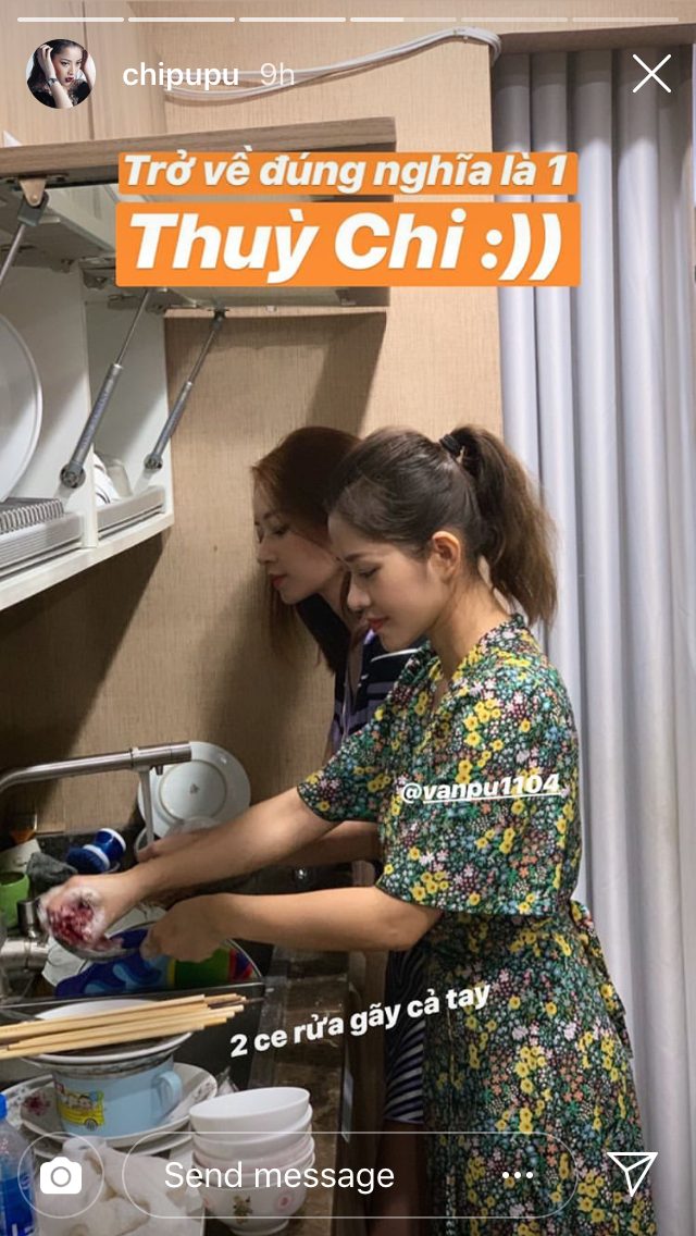 Chi Pu khoe ảnh rửa bát gãy cả tay cùng chị gái
