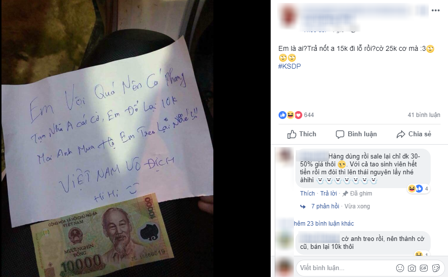 Thanh niên để lại 10k để chủ nhà mua cờ mới cùng với thần chú “Việt Nam vô địch”.