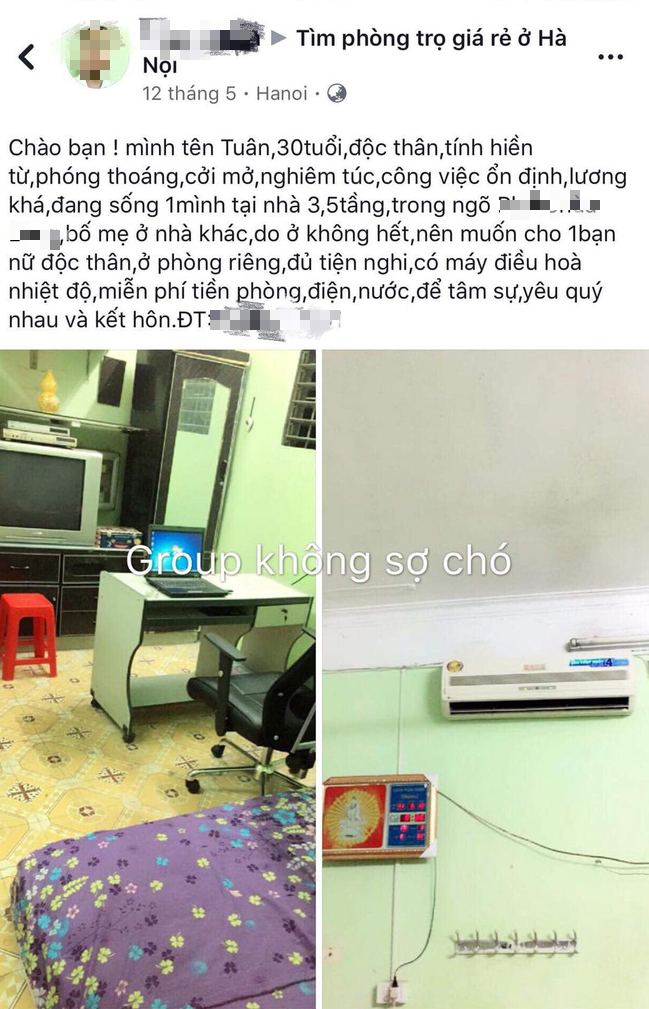 Nắm được tâm lý này, mới đây một thanh niên liên tục đăng vào một group mạng xã hội có tên Tìm phòng trọ giá rẻ ở Hà Nội thông tin như sau: ”Chào các bạn, mình tên Tuân năm nay 30 tuổi vẫn độc thân, tính tình hiền từ, phóng khoáng, cởi mở, nghiêm túc và có công việc ổn định lương cũng khá. Hiện đang sống 1 mình tại ngôi nhà 3,5 tầng bố mẹ thì ở nhà khác.