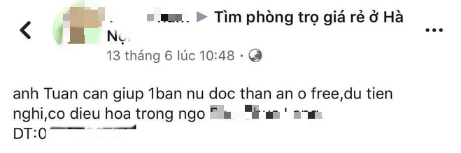 Bài viết từ tháng 6 với nội dung: ”Anh Tuân cần giúp 1 bạn nữ độc thân ăn, ở miễn phí. Đầy đủ tiện nghi, có điều hòa..sđt.