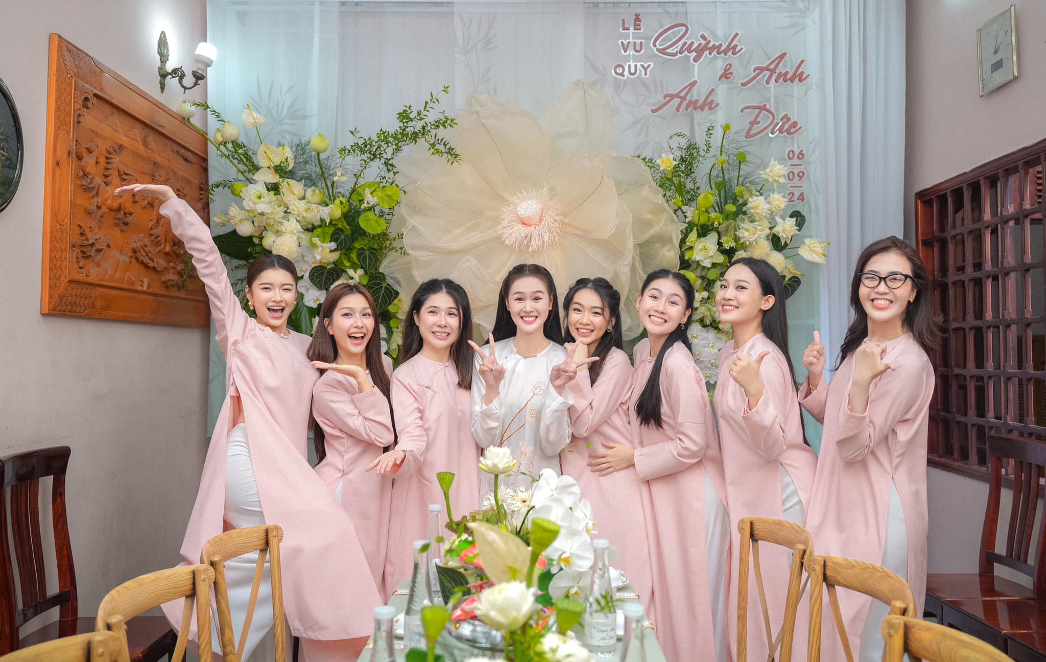 Sáng 6/9, lễ ăn hỏi của Anh Đức và Quỳnh Anh đã diễn ra tại nhà riêng ở TP.HCM theo nghi thức truyền thống. Không gian lễ được trang trí đơn giản với tông màu trắng - xanh - hồng chủ đạo. Cô dâu - chú rể chọn diện áo dài màu trắng, với điểm nhấn là phần hoạ tiết hoa sen được thêu tỉ mỉ.
