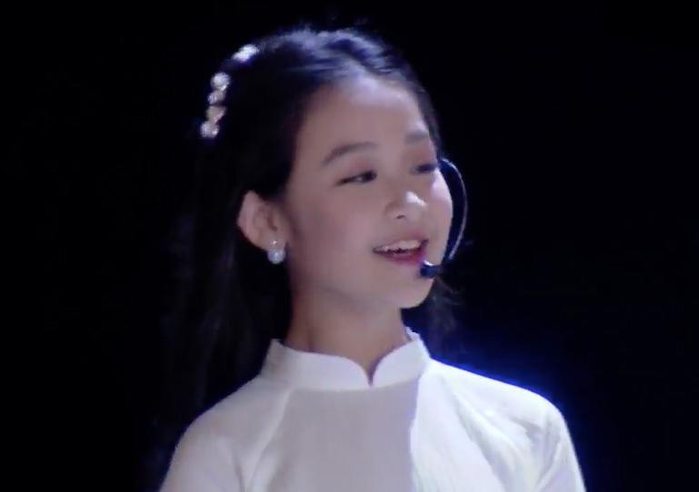 Tham gia chương trình, nhóc tỳ này thể hiện ca khúc Khúc ca yêu cuộc đời với nghệ sĩ Lưu Hiền Trinh và dàn múa thiếu nhi.