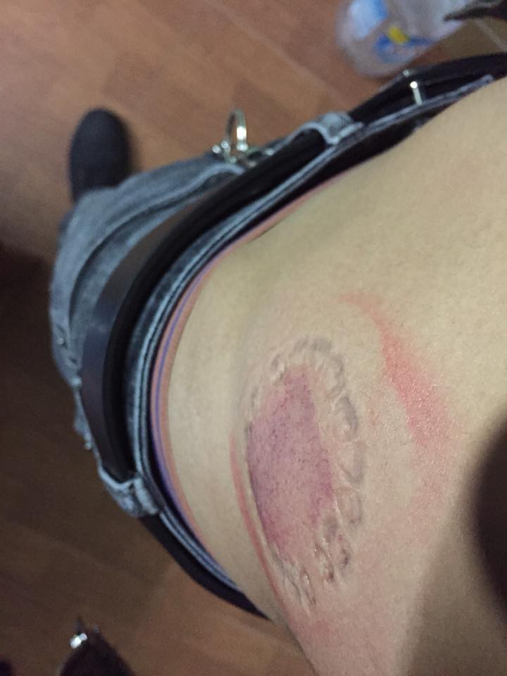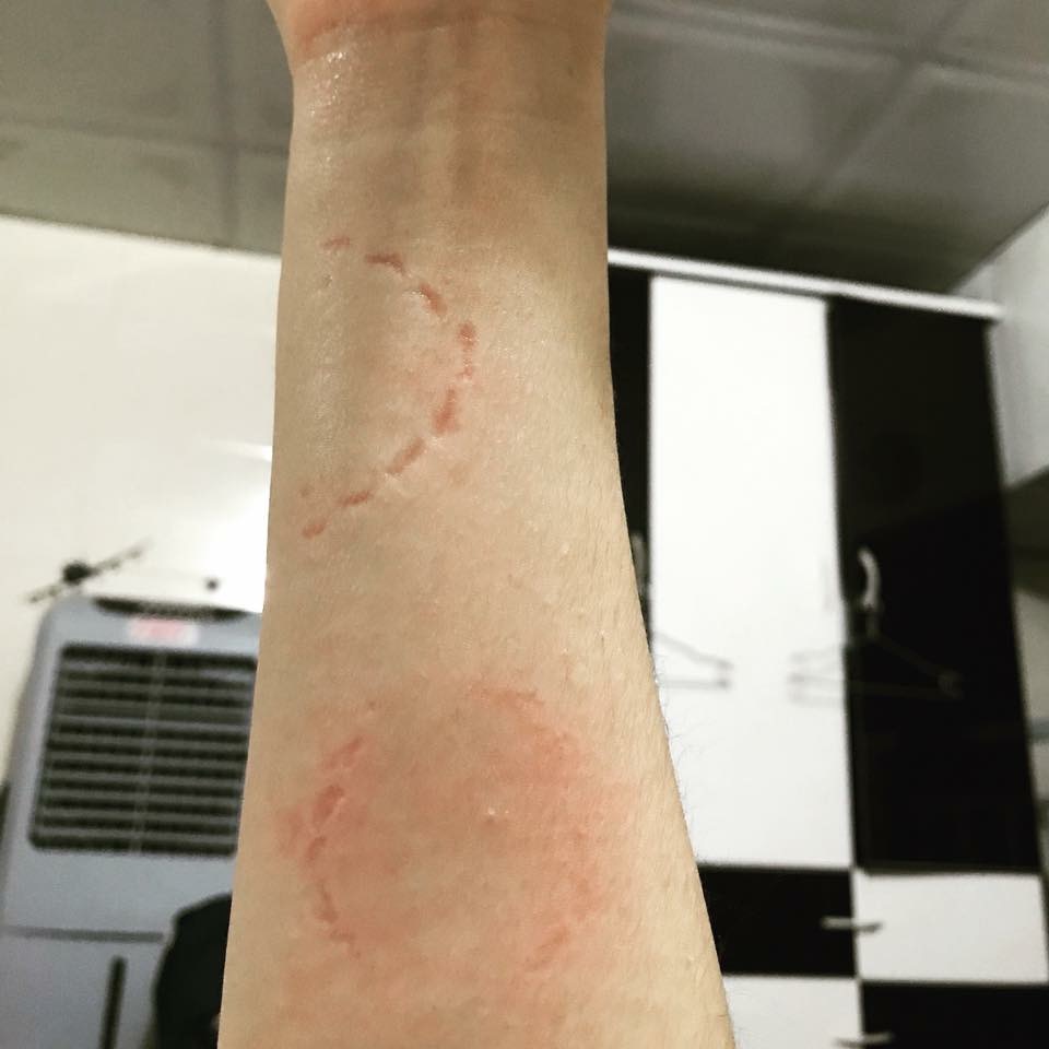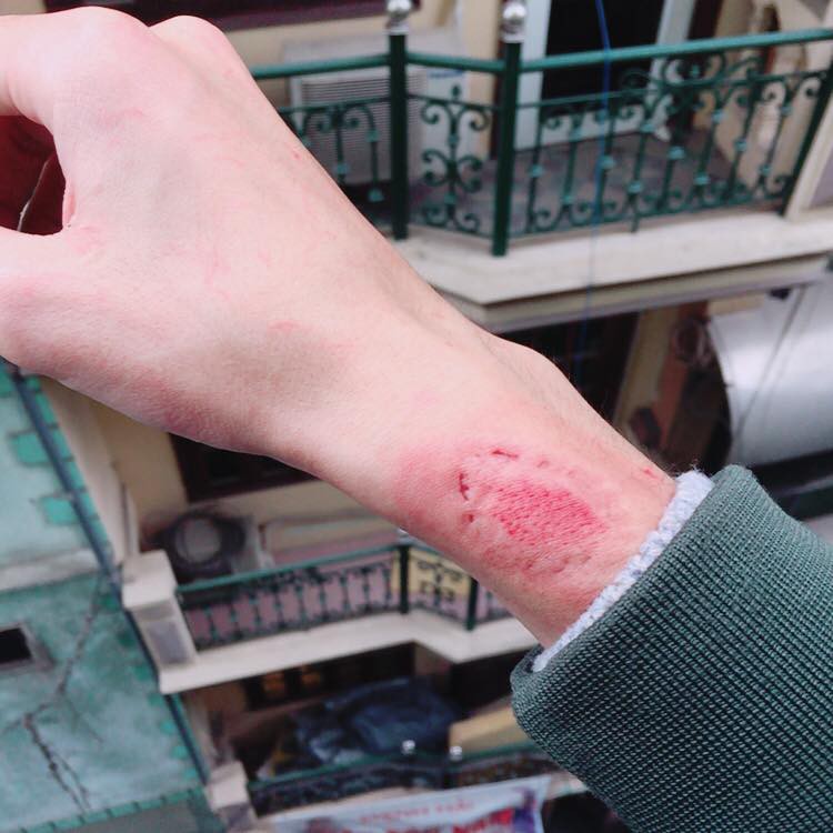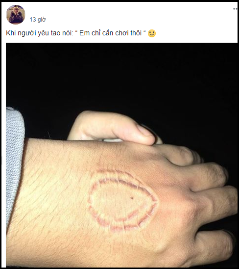 Chàng trai đó có nickname Tân Nguyễn, và như trên hình, bàn tay của anh chàng đang bị ”đóng dấu” bằng cả hàm răng của bạn gái. Vết cắn thật sự rất ”đáng sợ” và đau đớn, khiến bài viết đã thu về hàng nghìn lượt thích, kéo theo đó là ”hội nạn nhân” khác.
