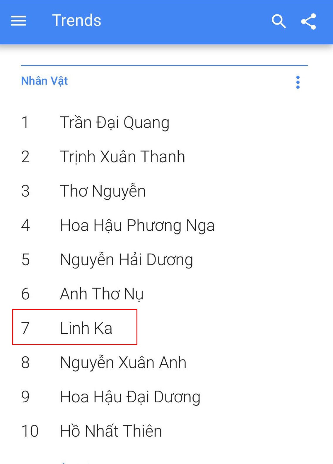 Linh Ka đứng ở vị trí thứ 7, mục nhân vật được tìm kiếm trên Google nhiều nhất tại Việt Nam.