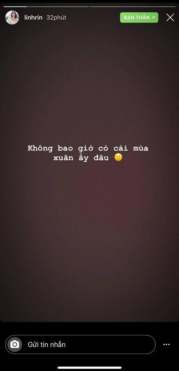 Mới đây nhất, Linh Rin khiến cư dân mạng tò mò khi tiếp tục đăng tải trạng thái “ẩn ý” chuyện tình cảm trên trang cá nhân. Cụ thể, cô viết: “Không có cái mùa xuân đấy đâu”. Dù chỉ là dòng chia sẻ ngắn gọn nhưng dân tình cho rằng cô nàng đang muốn nhắn nhủ đến “ai đó” trong thời điểm nhạy cảm này.