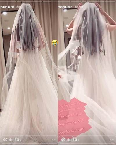 Trước đó, hồi cuối tháng 9, cũng trên story Instagram, Mie Nguyễn và bạn trai Dũng Anh cùng đăng bức hình chụp cô từ phía sau trong bộ váy cưới lộng lẫy, thu hút sự chú ý của người hâm mộ.