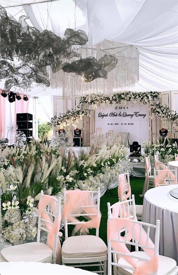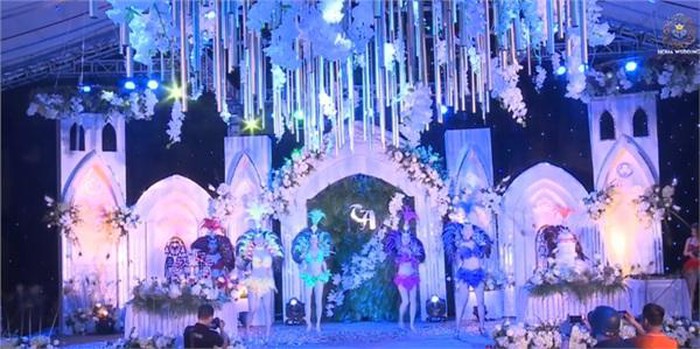 Được biết, với không gian rộng 1500m2, toàn bộ rạp cưới siêu lớn được dựng tại gia nhà cô dâu, tất cả đều được trang trí bằng 100% hoa tươi. Trong đó có 10 nghìn bông hoa hồng trắng nhập khẩu, 6 nghìn cành cẩm tú cầu, 3 nghìn cành lan hồ điệp trắng và vô số những loài hoa khác.