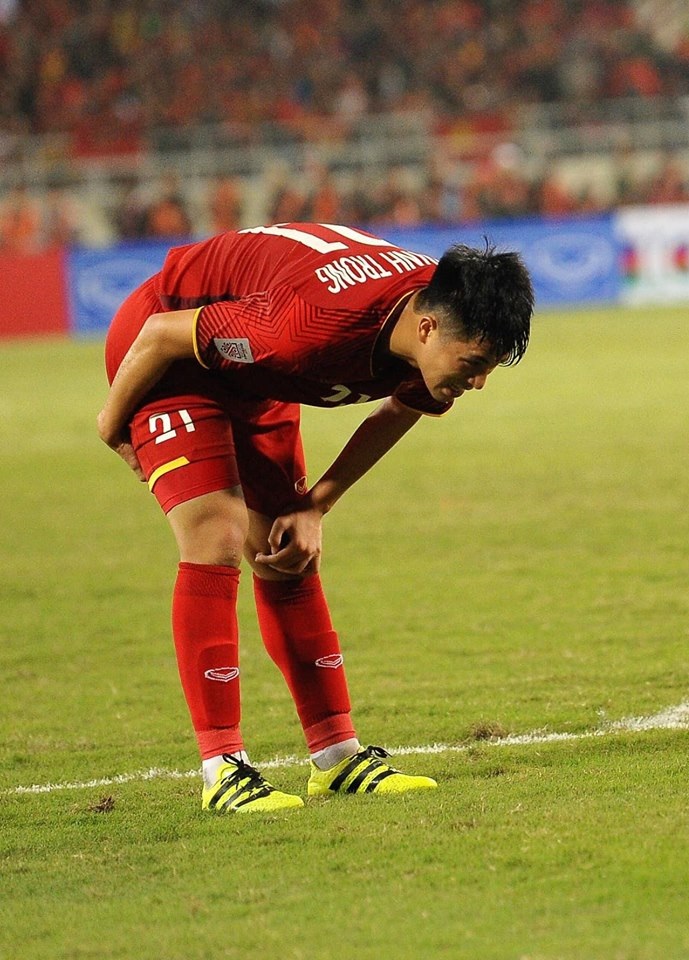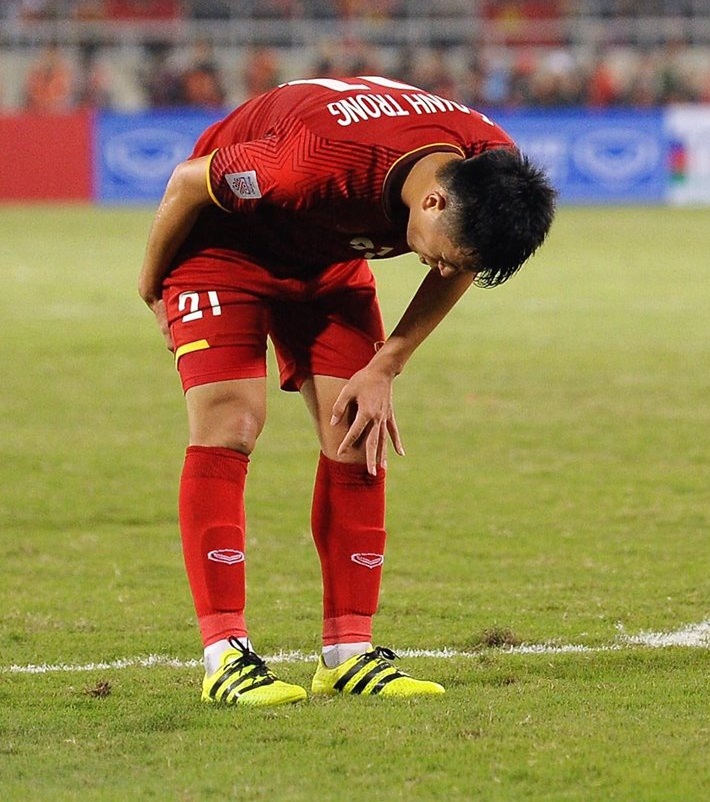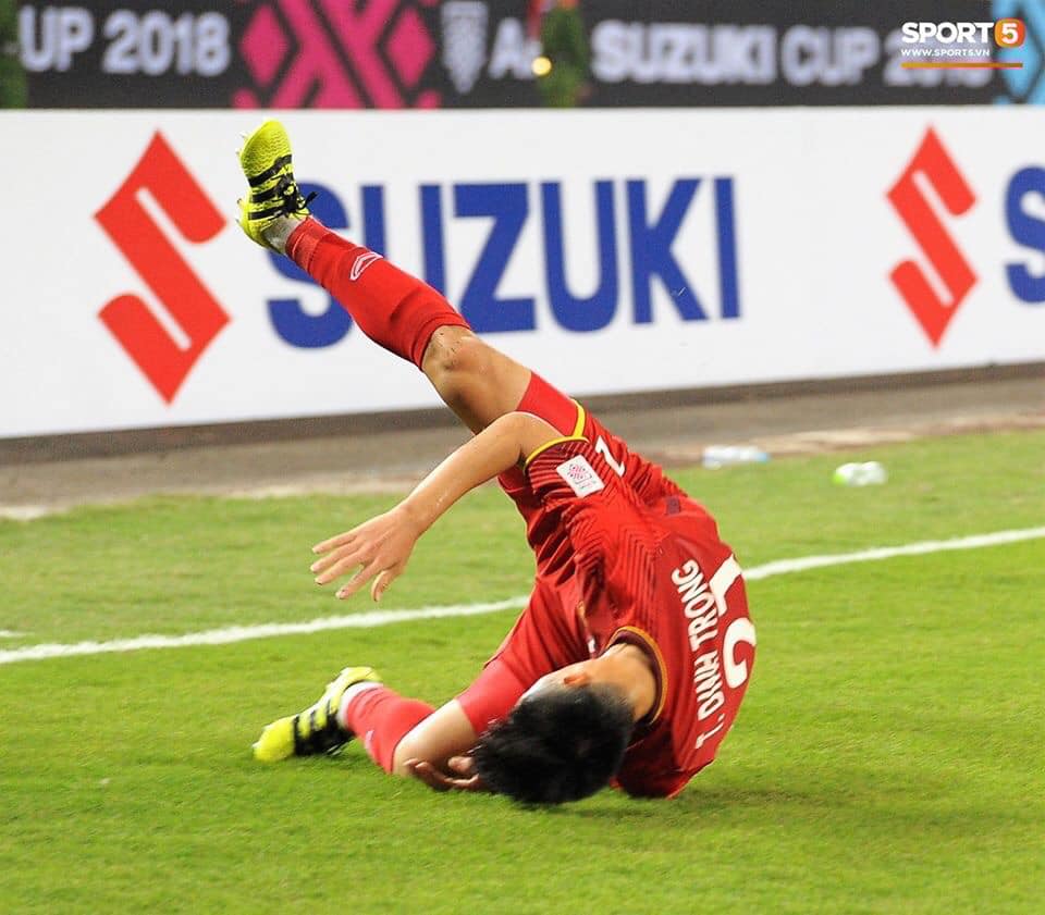Có thể thấy Đình Trọng bị ngã rất mạnh, phần vai và đùi trái tiếp đất và khiến chấn thương cũ có cơ hội tái phát. Tuy nhiên, trong sự lo lắng kèm động viên từ CĐV có mặt tại sân, chàng cầu thủ số áo 21 lại đứng dậy. Từ ánh mắt đến dáng ngồi của Đình Trọng cảm nhận rõ nét quyết tâm lớn lao đến nhường nào.