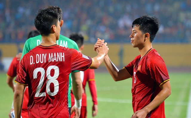 Sau khi thấy Đình Trọng nằm trên sân nhưng vẫn cố đứng lên, các đồng đội đã chạy đến để hỏi han tình hình và động viên 'lá chắn thép' của đội hình.