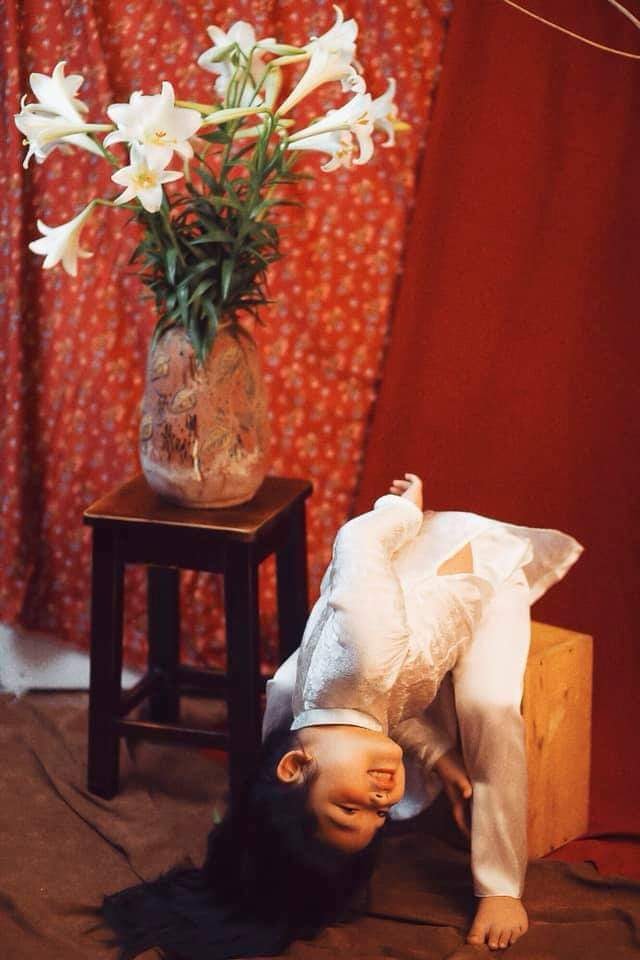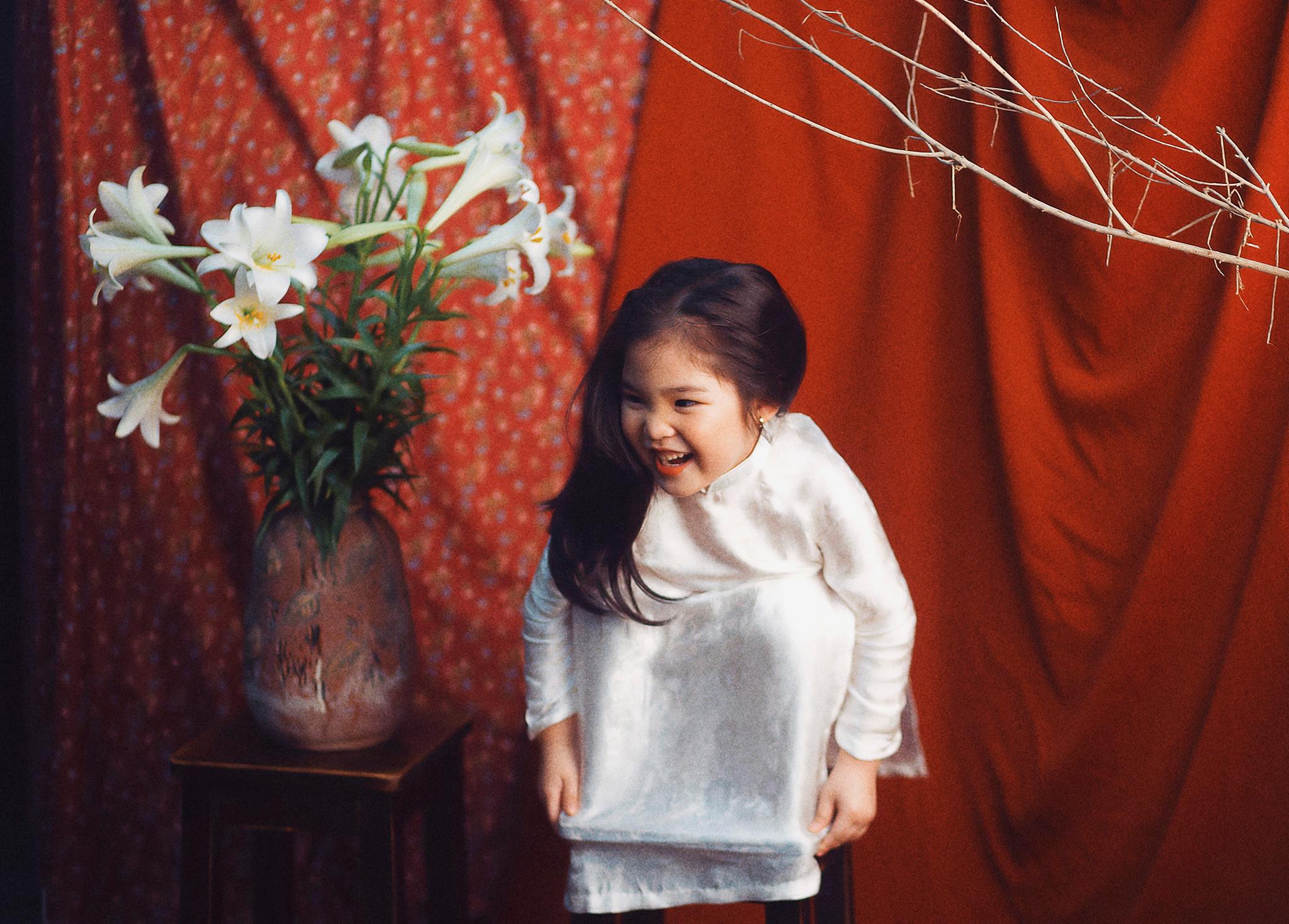 “Thiếu nữ'”5 tuổi bên hoa huệ phiên bản siêu “lầy lội”, đáng yêu. Ảnh: Nguyễn Vũ Thùy Linh