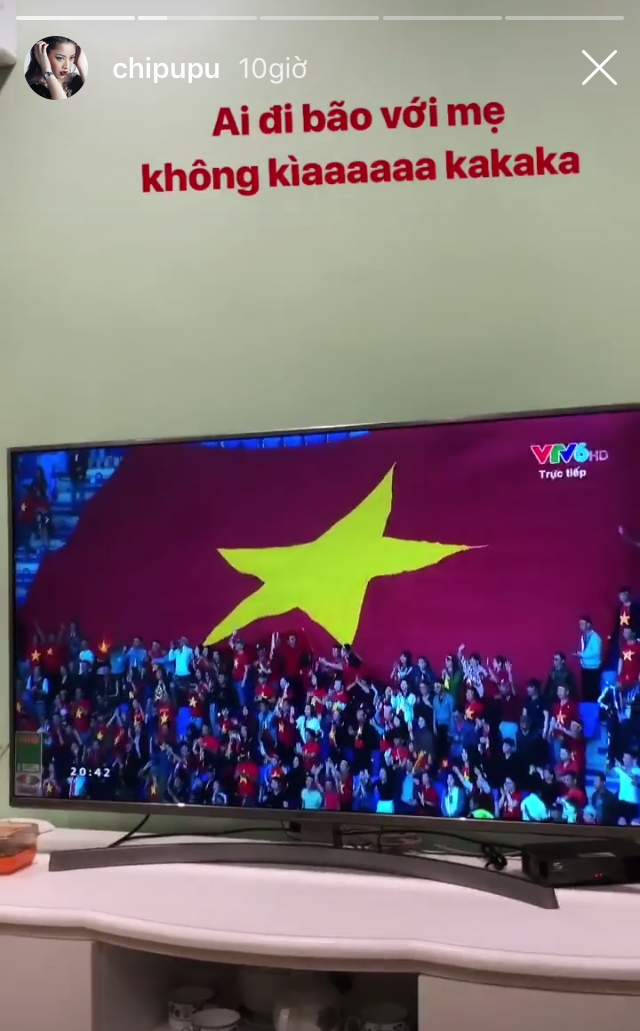 Cô nàng Chi Pu thì cùng mẹ “đi bão”. Cả 2 mẹ con đều là “fan cứng” của đội tuyển Việt Nam. Ảnh: instagram