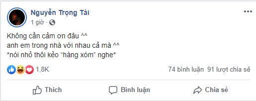 Danh hiệu nghệ sĩ “mặn mòi” nhất có lẽ nên thuộc về nam ca sĩ Nguyễn Trọng Tài khi anh liên tục ăn mừng chiến thắng của U22 Việt Nam bằng những dòng trạng thái hết sức “nhiều muối”. Trên trang cá nhân, giọng ca Hongkong 1 viết: “Không cần cảm ơn đâu, anh em trong nhà với nhau cả mà. Nói nhỏ thôi kẻo hàng xóm nghe”.