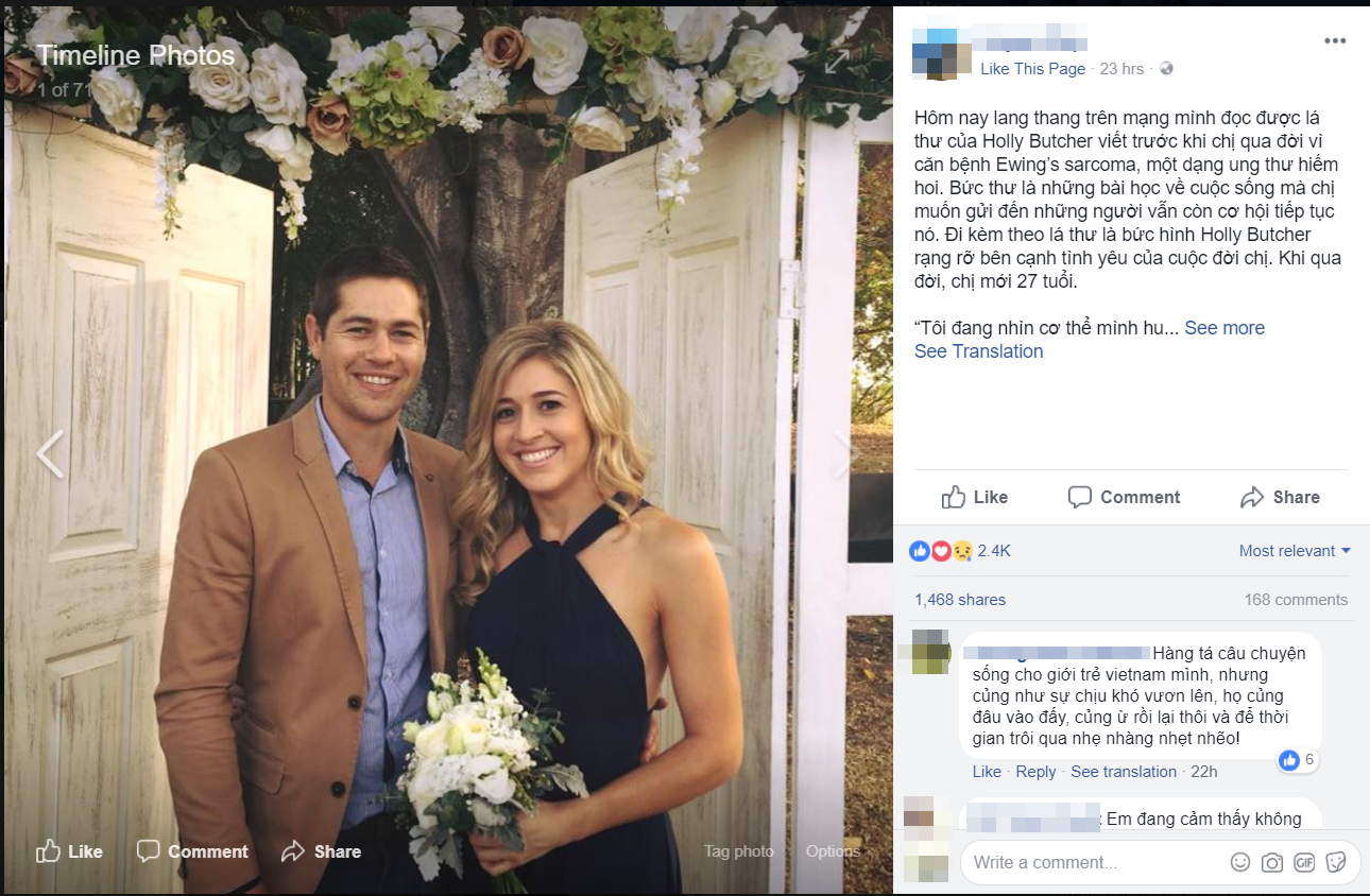 Bức thư là những bài học về cuộc sống mà chị muốn gửi đến những người vẫn còn cơ hội tiếp tục nó. Đi kèm theo lá thư là bức hình Holly Butcher rạng rỡ bên cạnh tình yêu của cuộc đời chị. Khi qua đời, chị mới 27 tuổi.