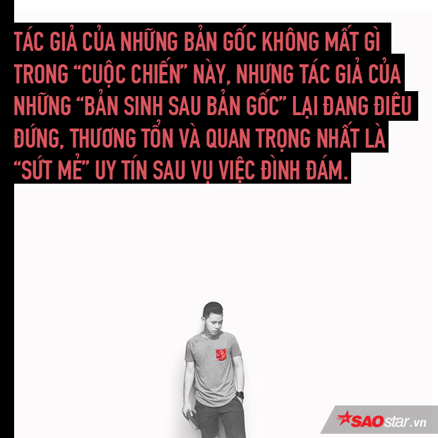 Động cơ thật sự là đòi công bằng cho những bản gốc hay “đánh đập” người trong cuộc? Có lẽ là cả hai, nhưng “dung lượng” cho vế thứ hai có vẻ nhiều hơn! Là bởi vì, tác giả của những bản gốc không mất gì trong “cuộc chiến” này, nhưng tác giả của những “bản sinh sau bản gốc” lại đang điêu đứng, thương tổn và quan trọng nhất là “sứt mẻ” uy tín sau vụ việc đình đám.