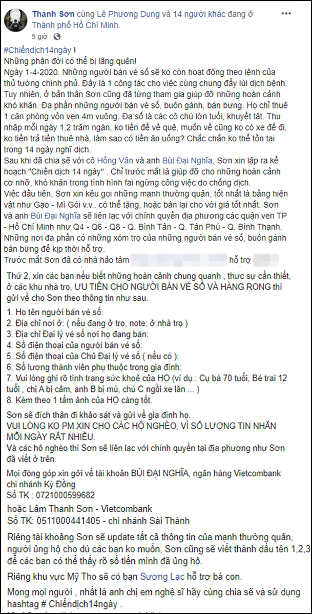 Bên cạnh việc kêu gọi quyên góp, MC Đại Nghĩa và diễn viên Thanh Sơn cũng sẽ liên hệ với chính quyền các quận, huyện tập trung đông người bán vé số, người nghèo thất nghiệp trên địa bàn TP HCM để hỗ trợ kịp thời.
