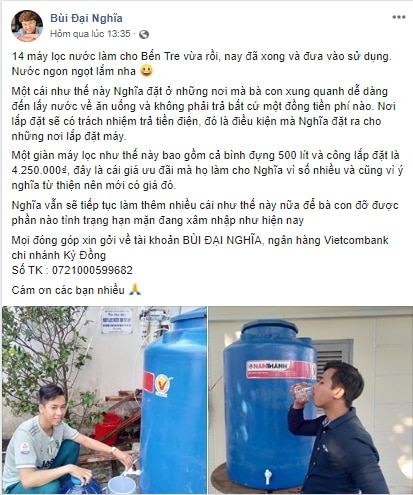 Đây không phải là lần đầu tiên MC Đại Nghĩa và những nghệ sĩ Việt đứng ra hỗ trợ những hoàn cảnh khó khăn. Gần đây nhất, MC Đại Nghĩa đã lắp đặt 14 máy lọc nước tại Bến Tre, 10 giếng nước tại Cà Mau để giúp người dân miền Tây vượt qua hạn mặn và vẫn sẽ tiếp tục từ thiện tại nhiều tỉnh khác.