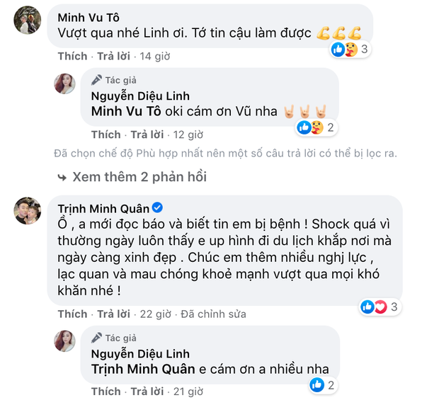 Sau khi biết được thông tin trên, nhiều nghệ sĩ Việt cũng như đồng nghiệp tại nơi nữ MC công tác đã gửi lời cổ vũ, động viên với mong ước cô gái 9x sẽ mạnh mẽ hơn, sớm chiến thắng căn bệnh ung thư quái ác.